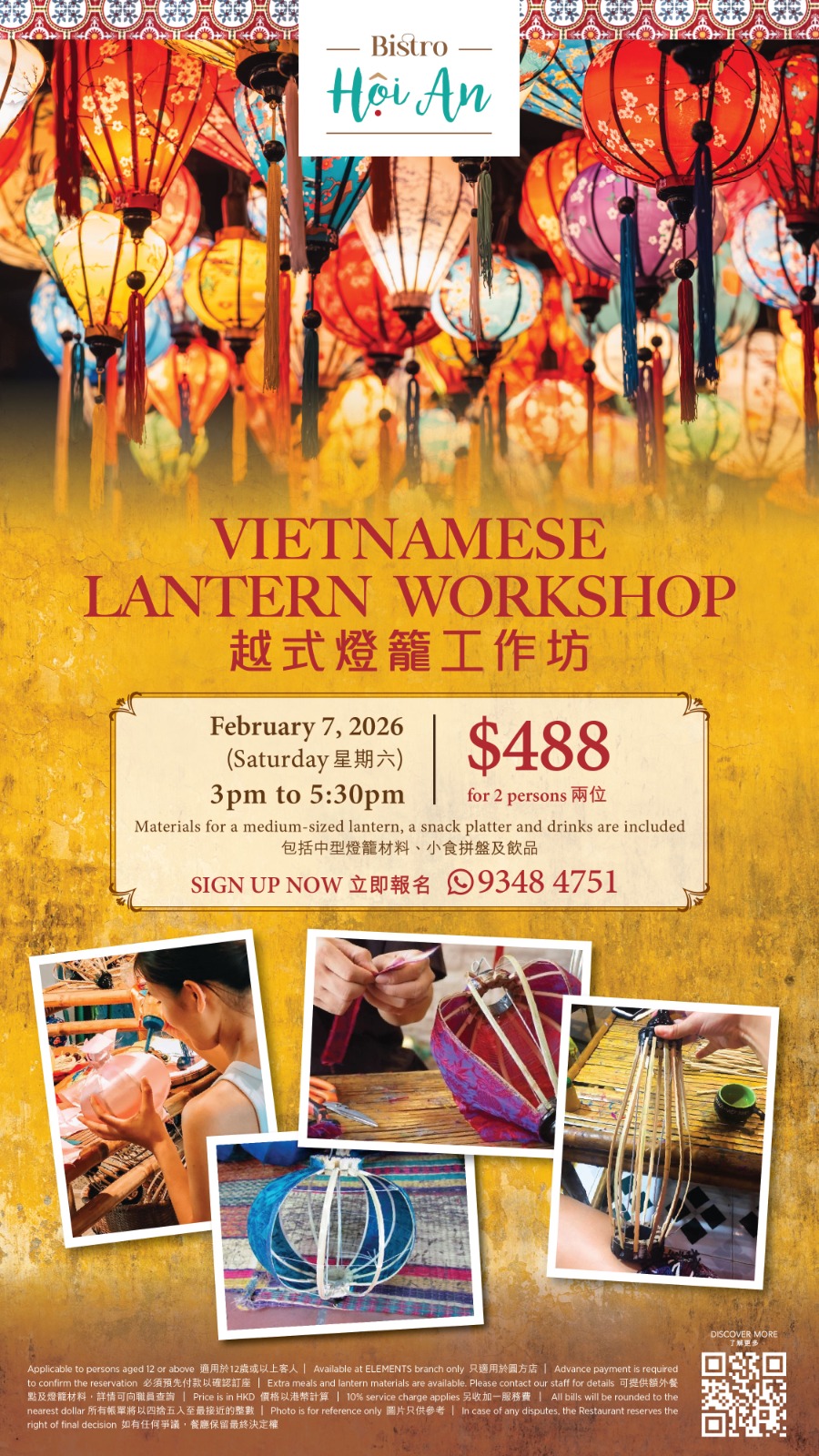 Join us for our first Vietnamese Lantern Workshop on Feb 7 at ELEMENTS! For HK$488, enjoy a snack platter and drinks for 2 with materials for a medium-sized lantern. Book to illuminate the festivals!