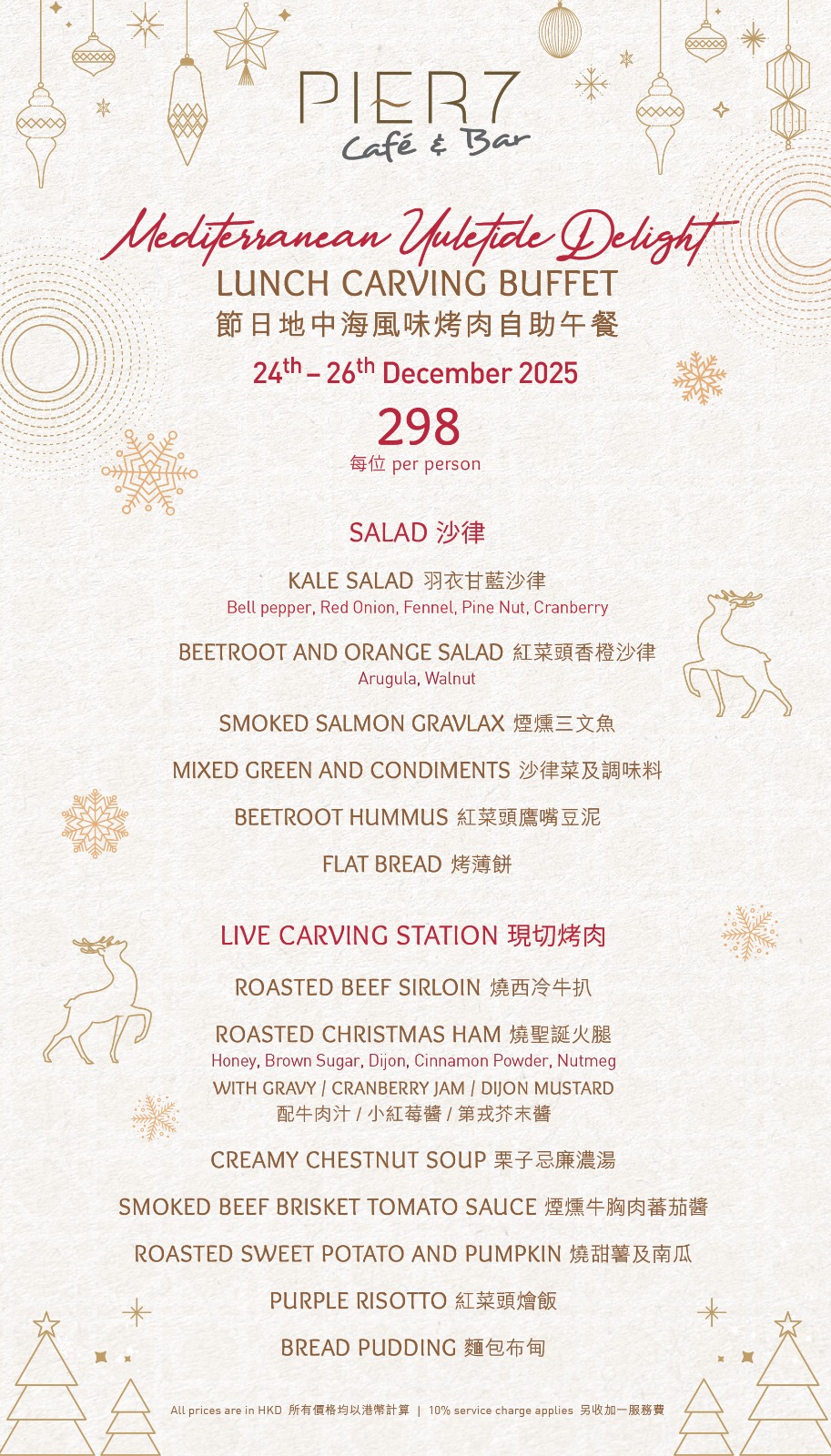 Gather for our festive lunch craving buffet from December 24 to 26. For HK$298 per person, enjoy a celebratory spread including Roasted Beef Sirloin, Roasted Christmas Ham, and more!